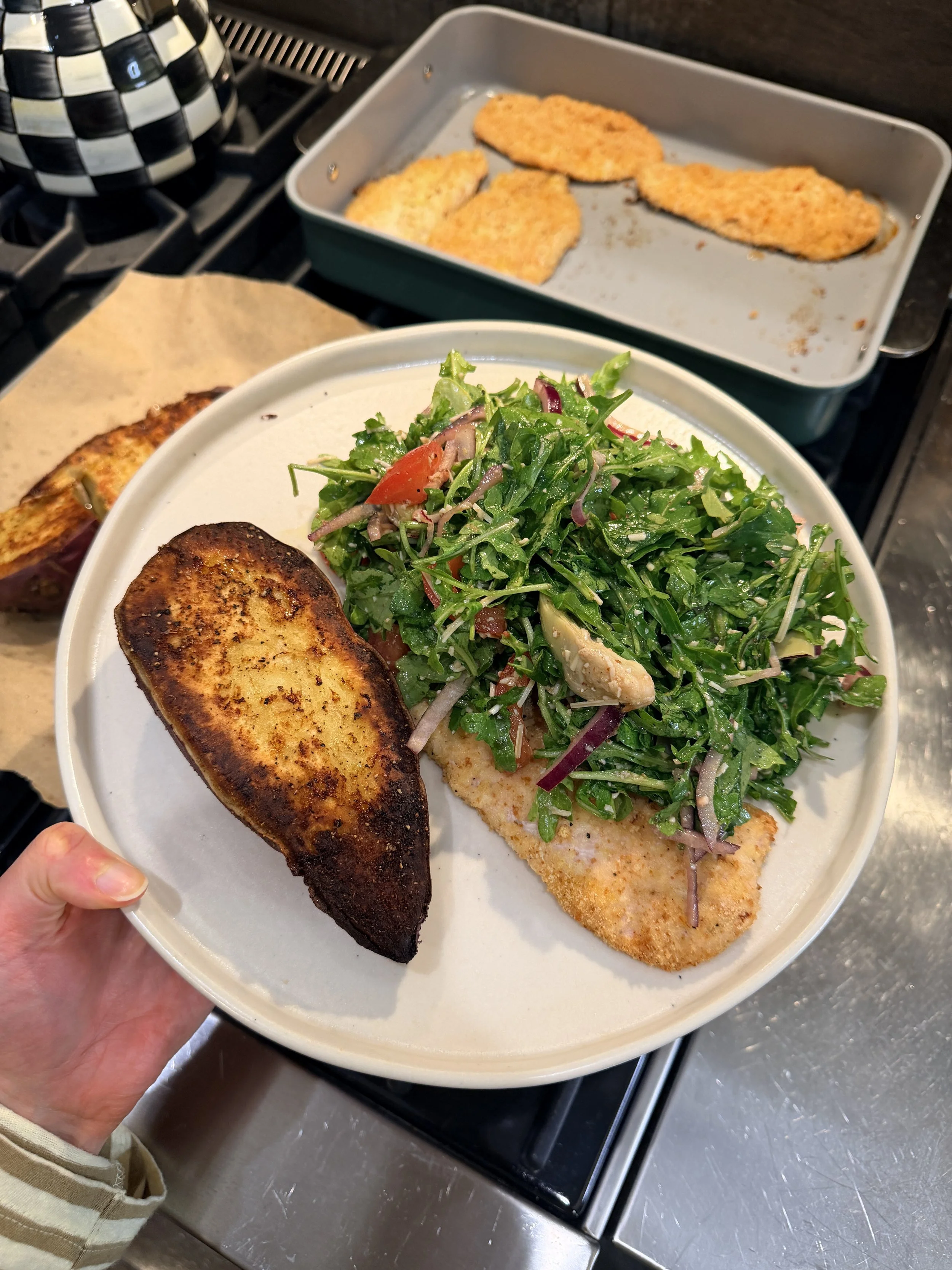 A classic favorite with a simple, satisfying twist. This chicken paillard keeps things light, crispy, and full of flavor—perfectly paired with the sweet potatoes and fresh salad for a well-rounded meal.