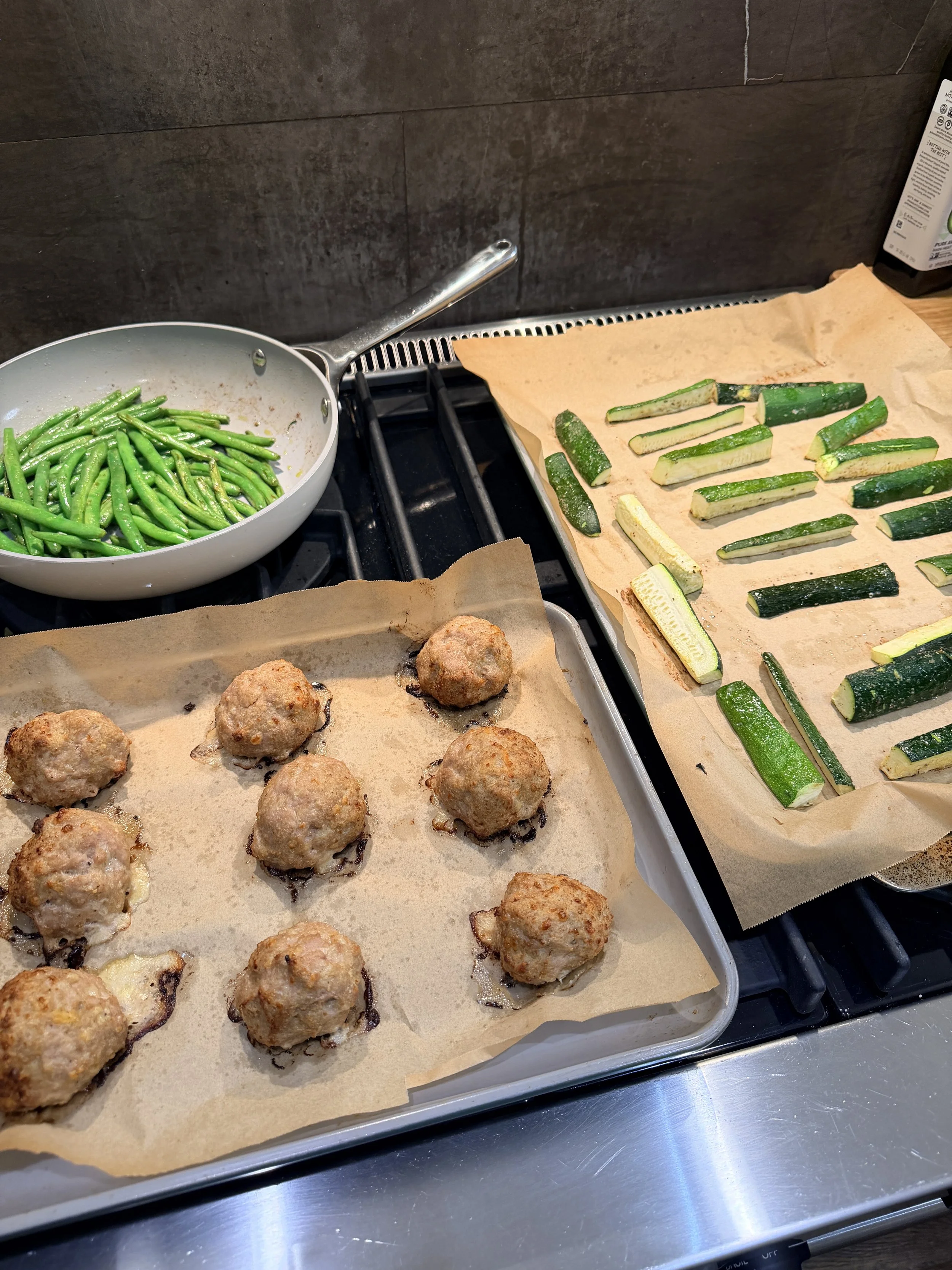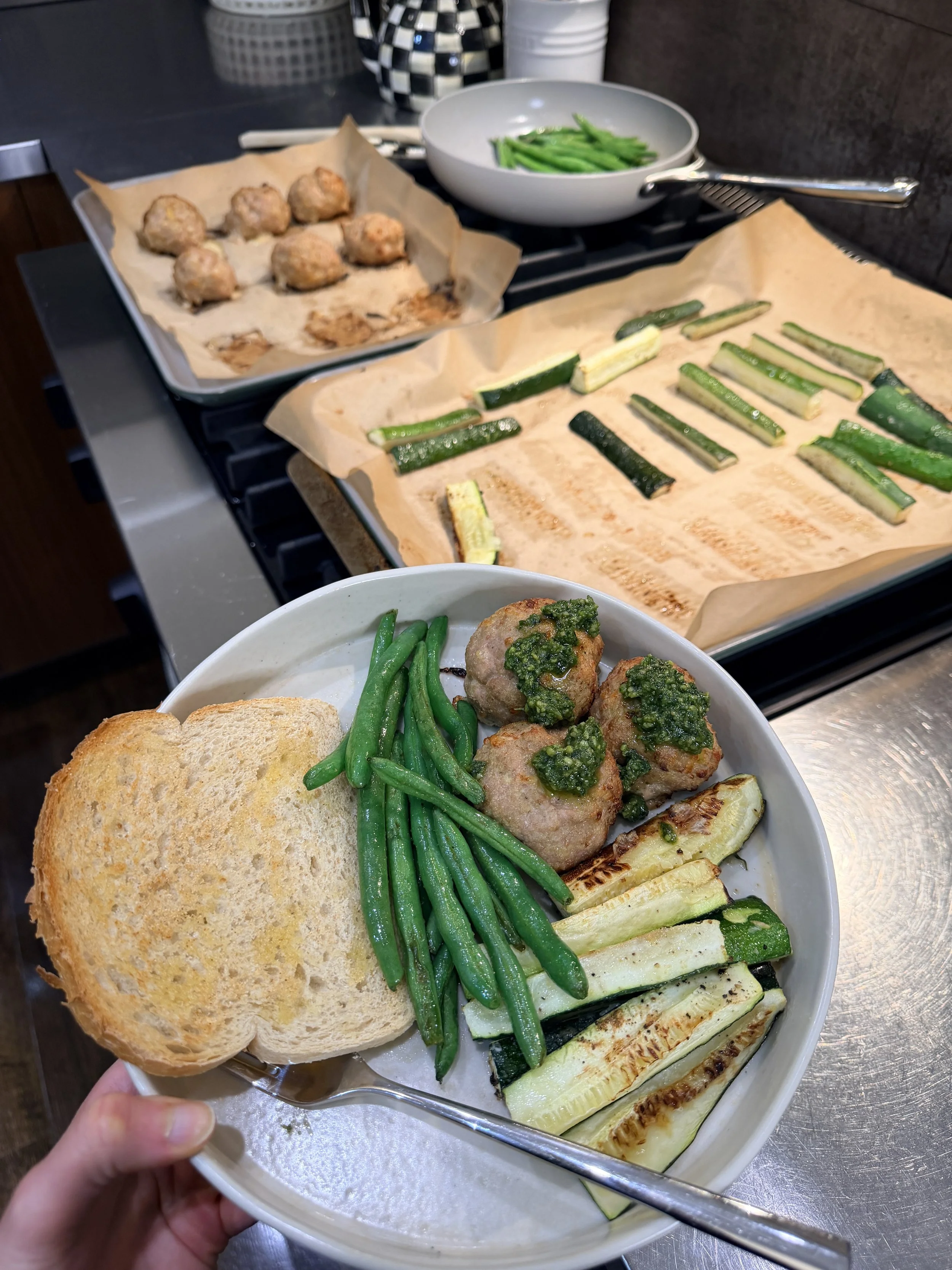 These chicken meatballs are the definition of low effort, high payoff. Made with simple ingredients and baked to perfection, they’re juicy, flavorful, and easy to pair with roasted vegetables and a spoonful of pesto for a balanced, satisfying dinner.
