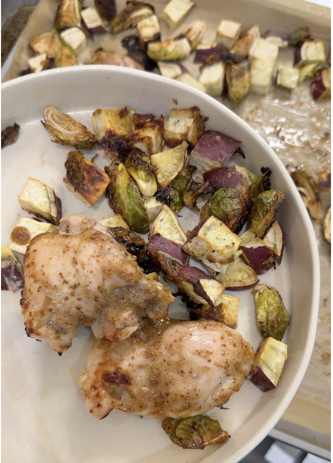 Honey Mustard Chicken Thighs with Roasted Sweet Potatoes & Brussels Sprouts