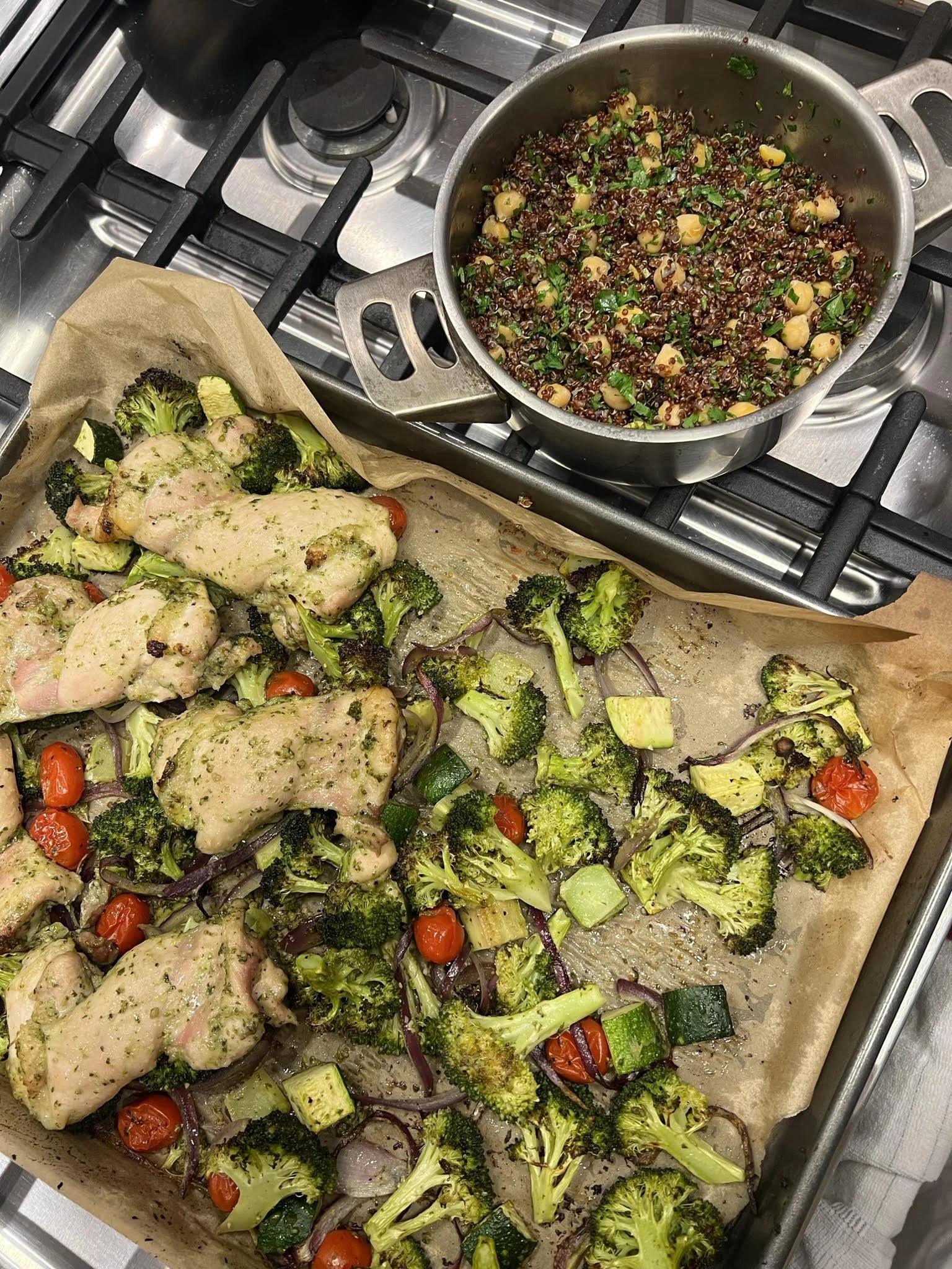 Add the quinoa and chickpeas to your bowl followed by pesto chicken and veggies. Top with grated parmesan cheese (optional). Enjoy!