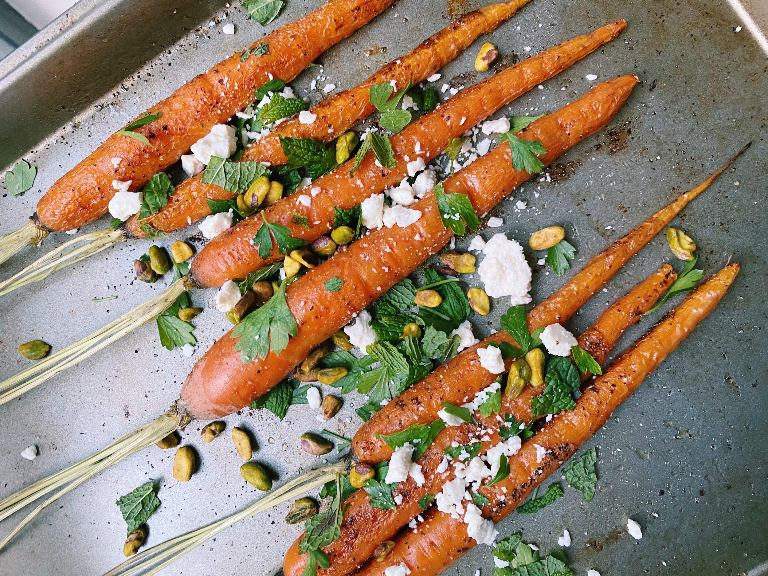 Once carrots are slightly cooled, top with feta, pistachios, mint and parsley