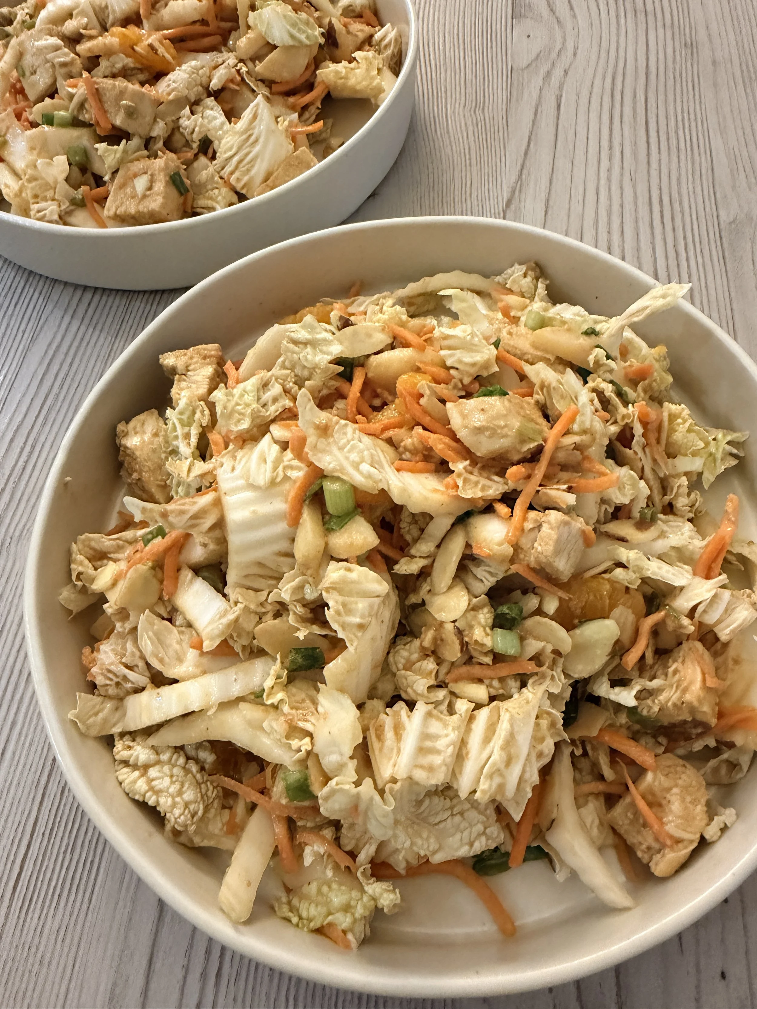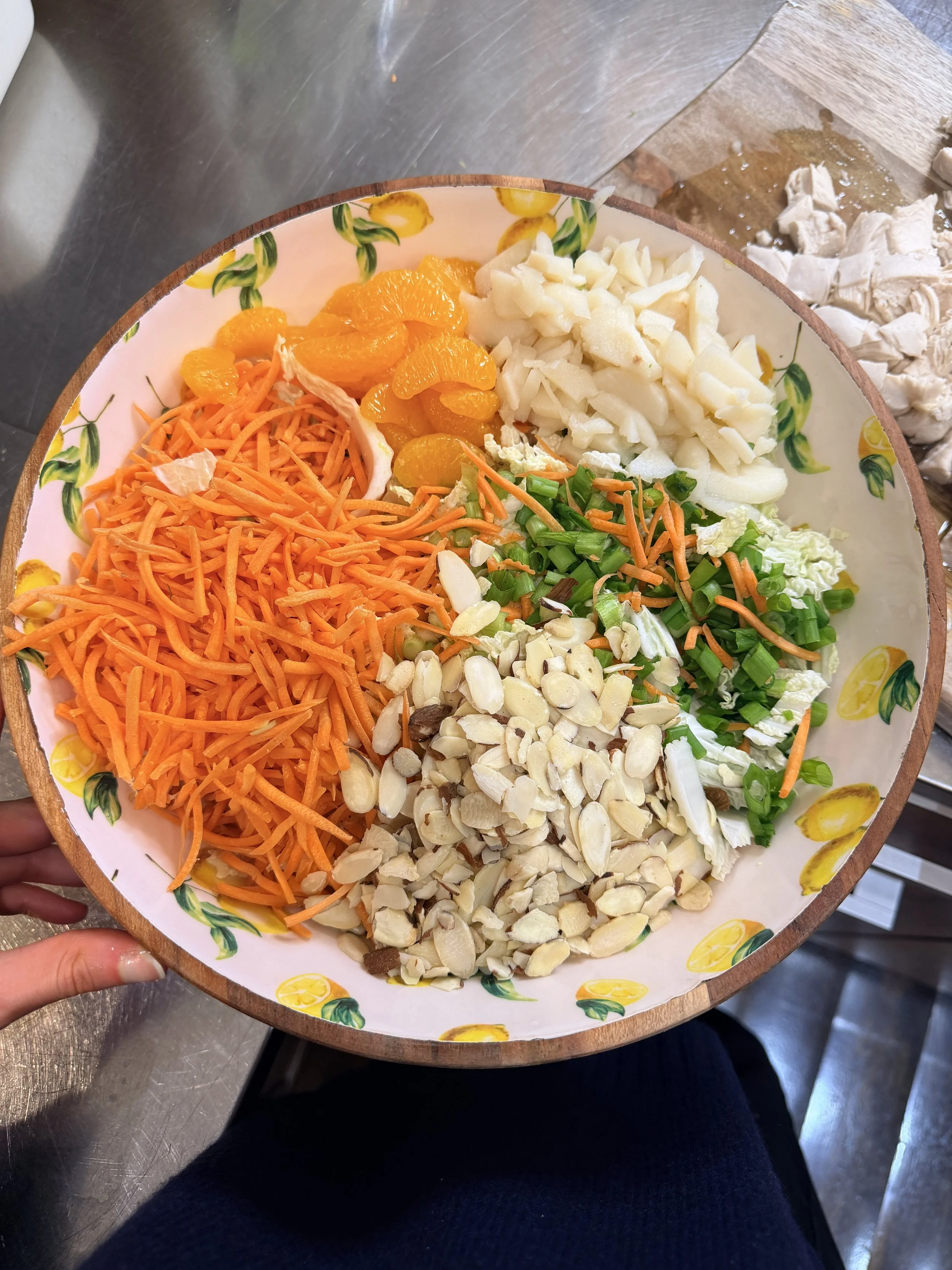 While the chicken cooks, assemble the salad. In a large bowl, combine the napa cabbage, shredded carrots, scallions, slivered almonds, water chestnuts, and mandarin oranges.