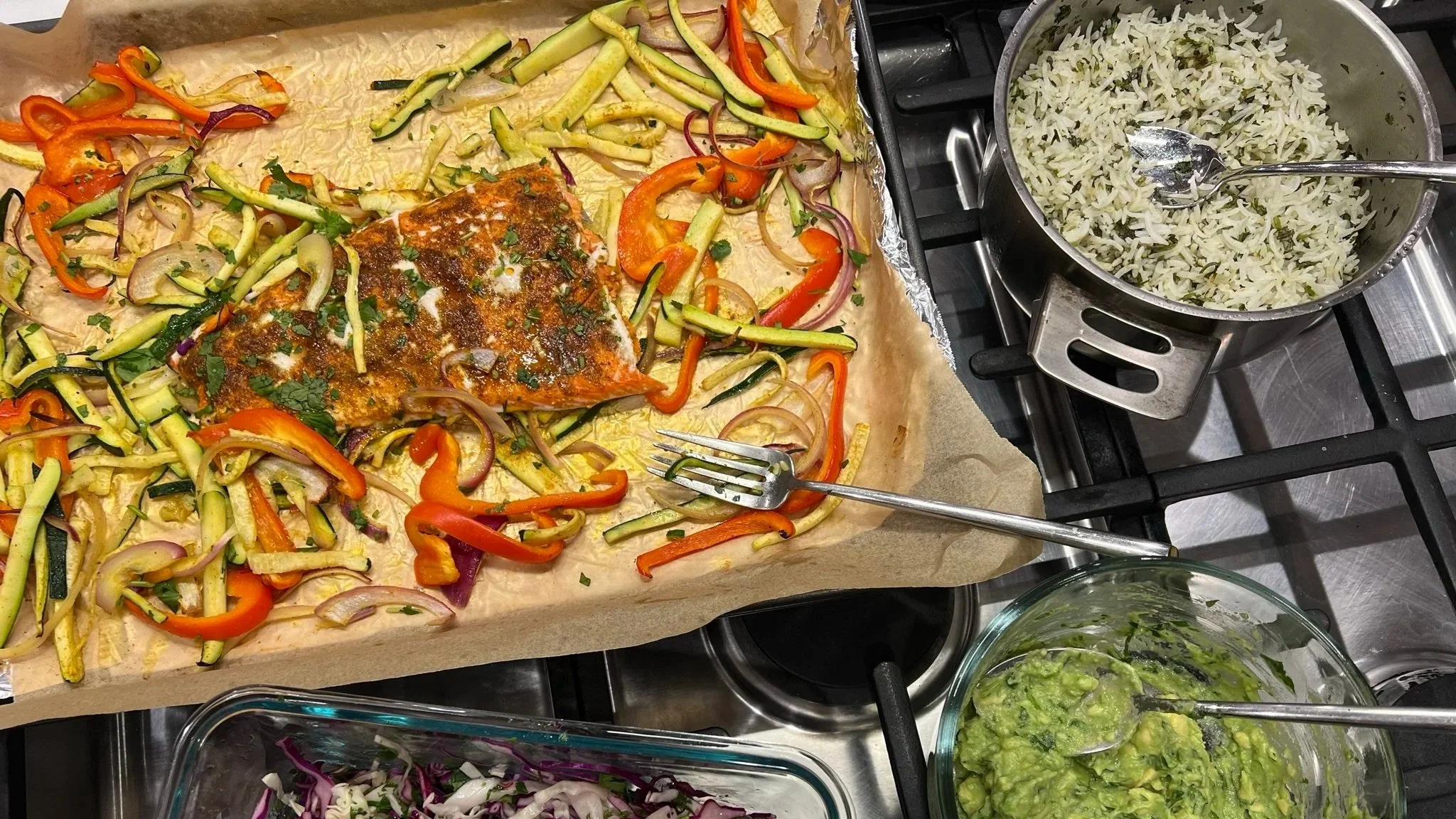 While the sheet pan is in the oven, prepare the slaw and guacamole: